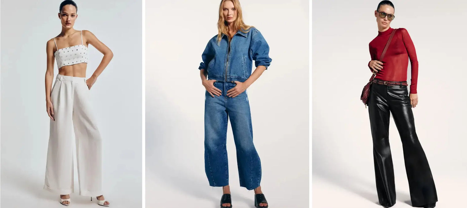 A calça wide leg é a queridinha do momento e promete continuar em alta. Com pernas largas e caimento solto, ela alonga a silhueta e traz conforto imediato. Em jeans ou alfaiataria, é ideal para compor looks versáteis e cheios de elegância.