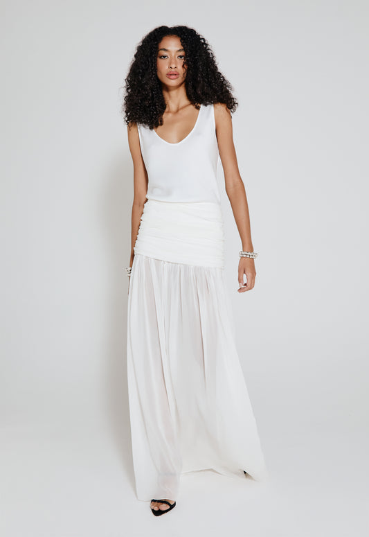 Para eventos diurnos ou em climas mais quentes, a saia longa branca combina frescor e sofisticação, criando um look leve e super feminino.