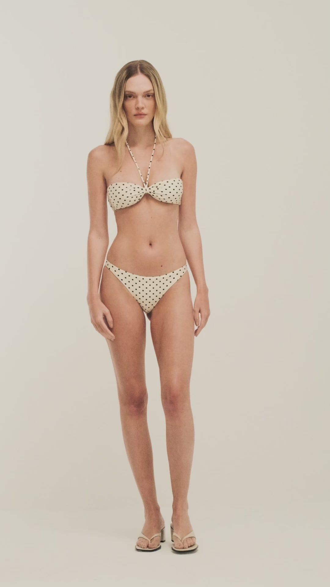 Em poá baunilha com preto, a Calcinha Mimosa traz silhueta de inspiração retrô e cobertura chic, que valoriza as curvas de maneira natural. Uma modelagem elegante, atemporal e sofisticada, parte da estreia beachwear Bonne Soirée.