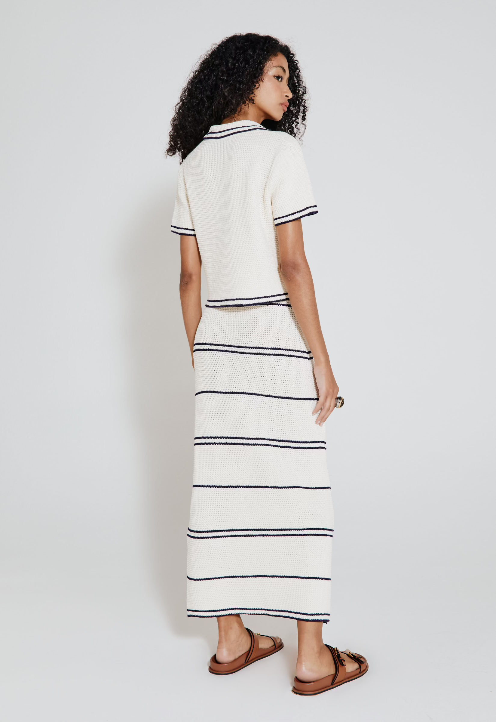 Blusa polo em tricot com detalhe de listras.