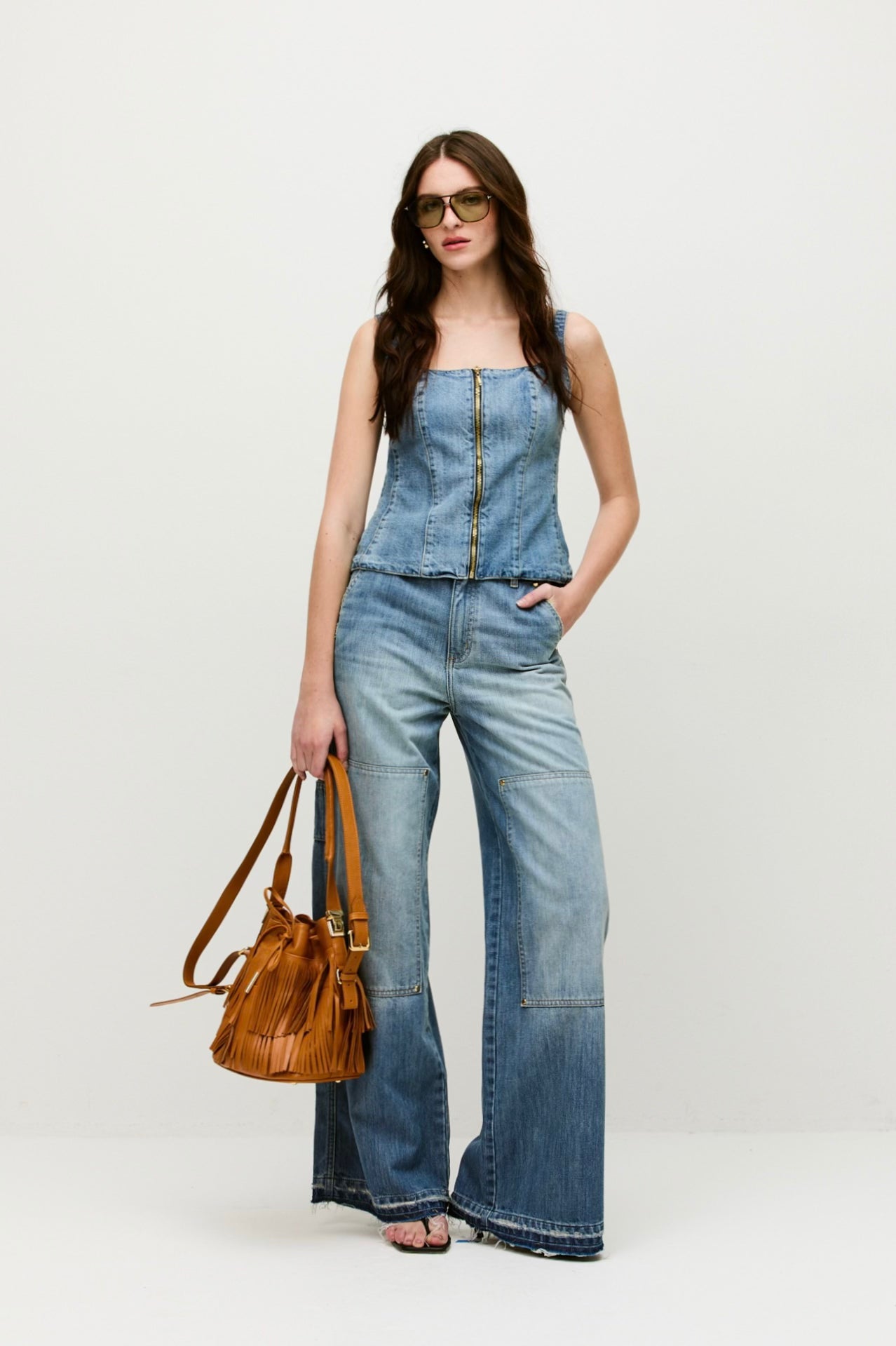 No azul clássico do denim, com áreas suavemente desbotadas que dão contraste e deixam a peça versátil e contemporânea, é um modelo que atravessa estilos e atualiza o guarda-roupa com autenticidade.