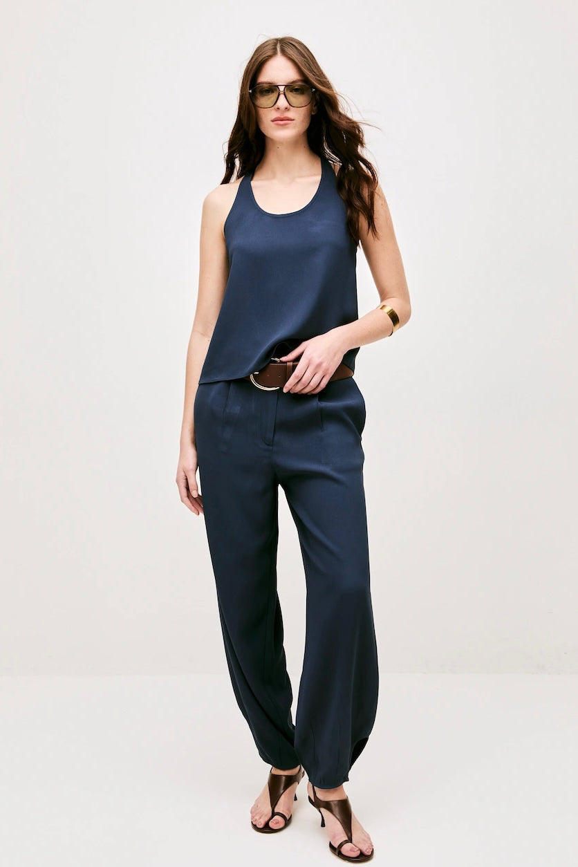 A Calça Natalie tem cintura média e pregas frontais que dão movimento ao shape de alfaiataria. As pernas afunilam levemente no tornozelo, criando uma silhueta elegante e atual.