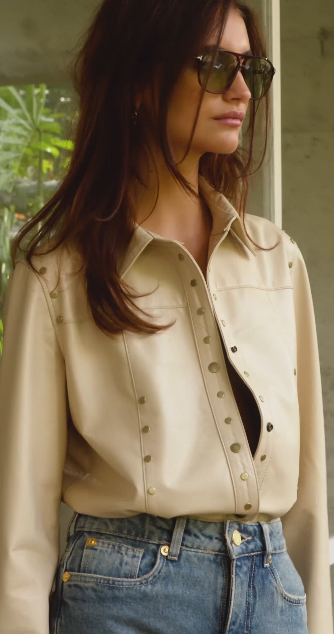 Nossa icônica Jaqueta Vivienne tachas agora surge em uma nova versão para a temporada de verão, apresentada no tom bege. Confeccionada em couro 100% natural. As tachas em metal ouro-velho adicionam atitude ao design.