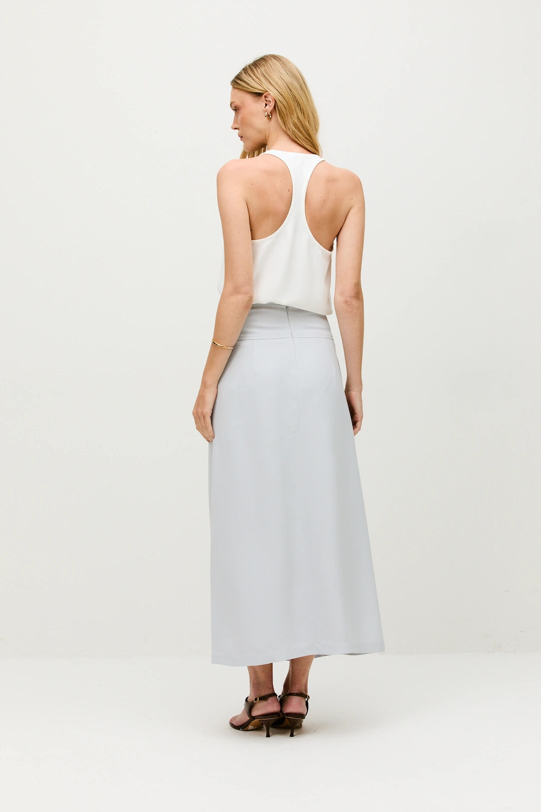 A Saia Natalie apresenta uma silhueta midi minimalista marcada pela fenda central, que revela uma versão mais curta ao andar. Minimalista, mas com caráter único, é uma peça que atualiza a alfaiataria com frescor e sofisticação.