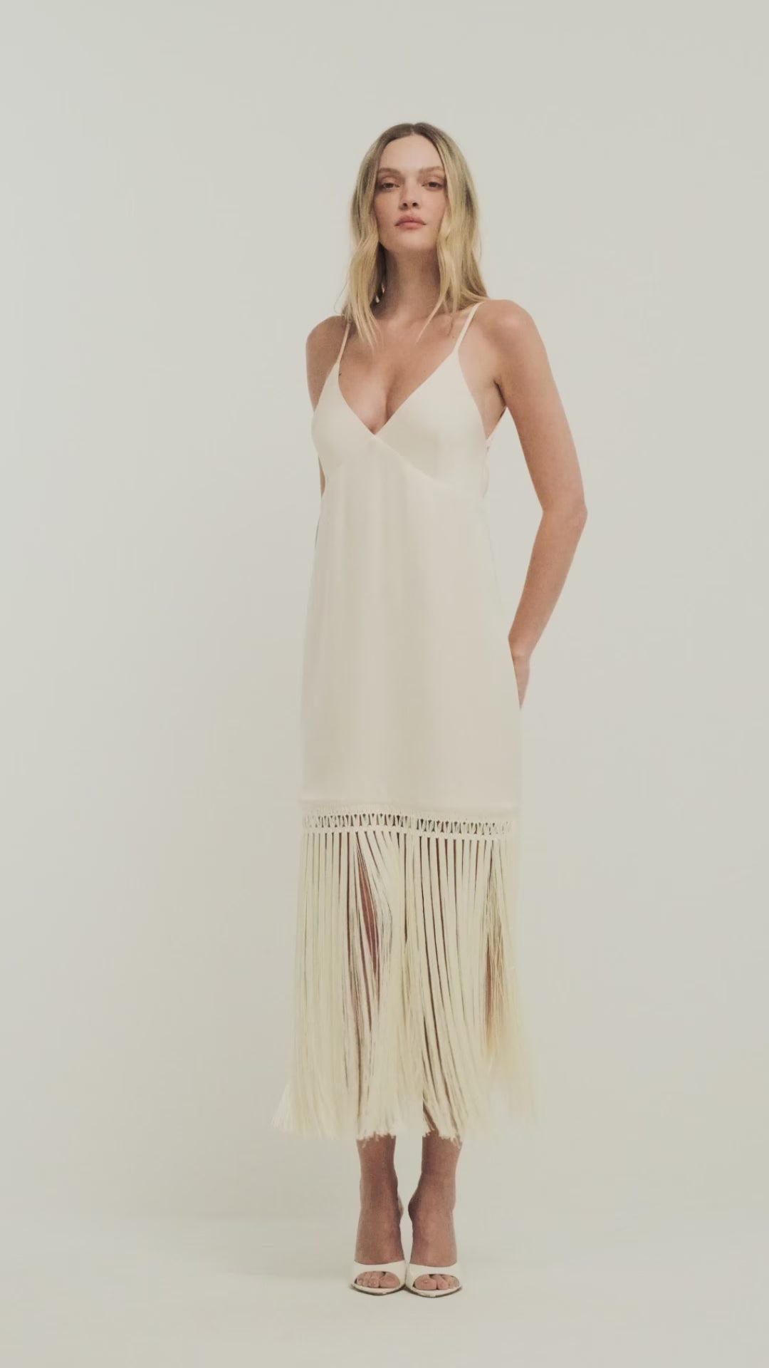 O Vestido Anna é uma releitura do nosso best-seller Vestido Alanis, em uma versão repaginada para o verão Nouvelle Vague. O detalhe de franjas na barra adiciona textura e movimento ao design minimalista, enquanto o decote em “V” e as alças finas revelam uma feminilidade leve e atual.