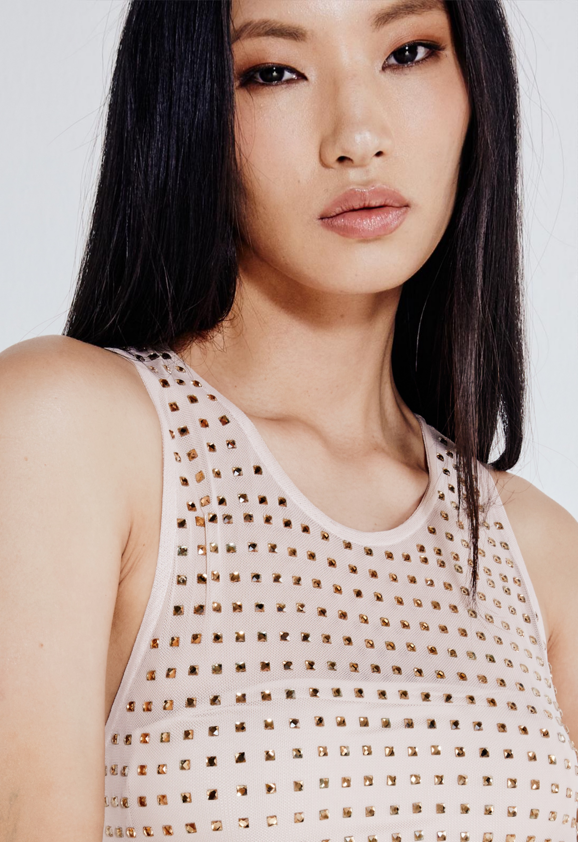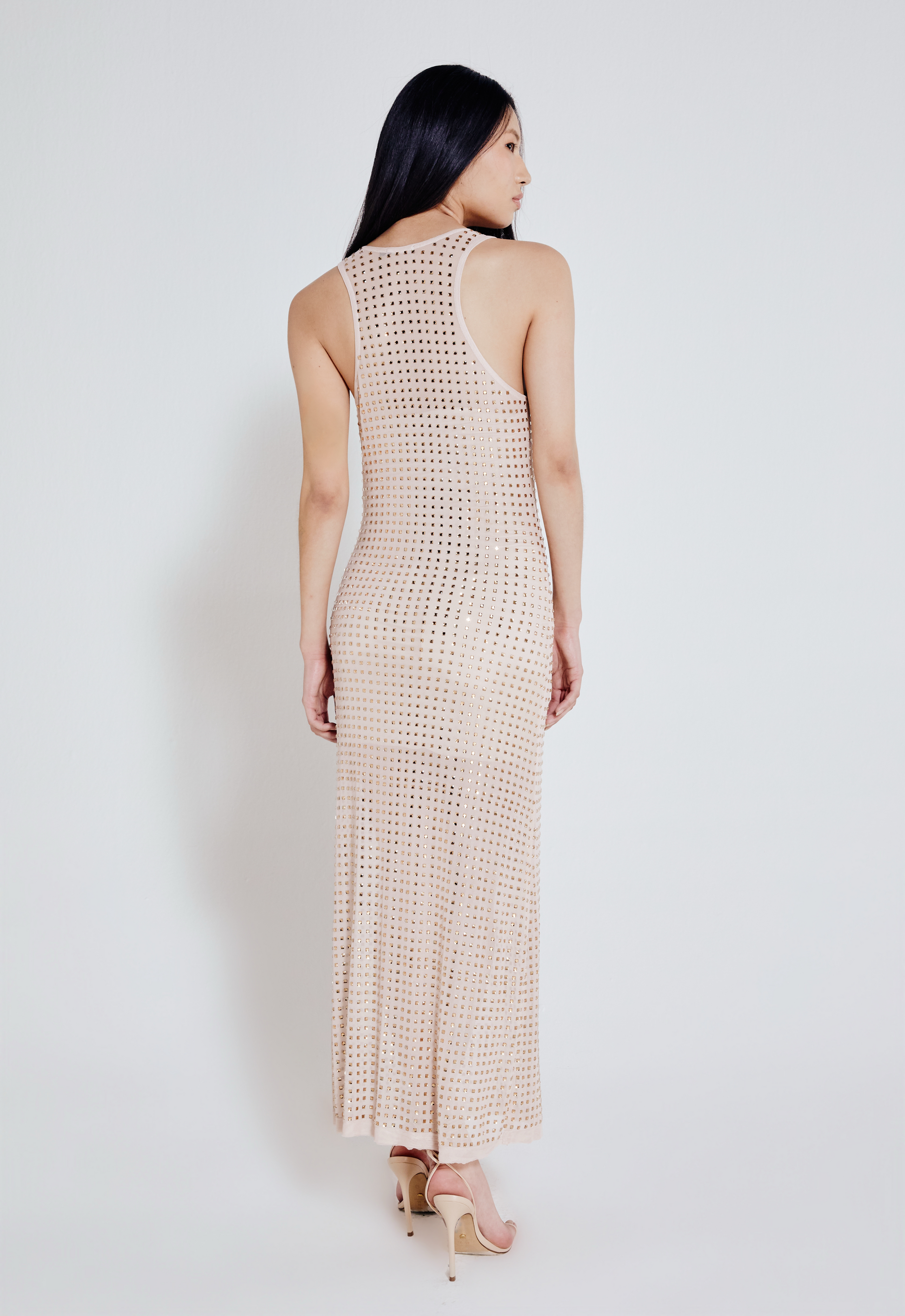 Vestido longo em tule com aplicação de cristais quadrados. Com design minimalista, decote levemente arredondado, é uma peça que alia elegância e sutileza, perfeita para ocasiões especiais.