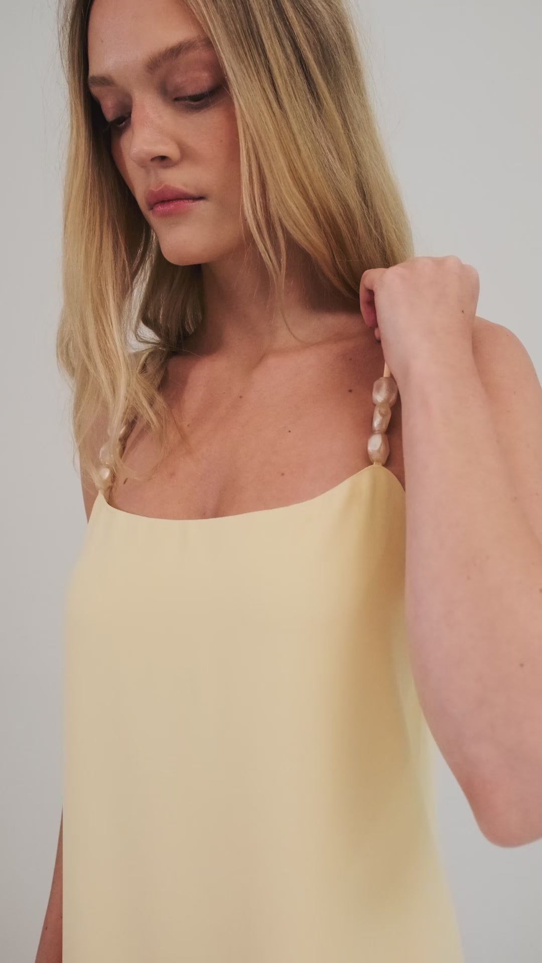 O Vestido Isabelle é uma peça única, ideal para o verão après-soleil. Com alças finas e aviamentos perolados, traduz leveza e sofisticação em uma leitura minimalista que traz frescor aos looks da temporada.